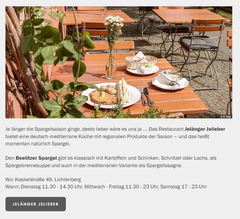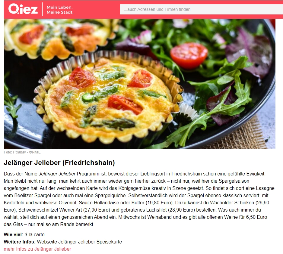 Auf der Speisekarte des Restaurants Jelänger Jelieber finden sich beliebte Klassiker und zeitgemäße Speisen sowie regionale und saisonale Spezialitäten. Diese werden größtenteils ohne Konservierungsstoffe und Geschmacksverstärker zubereitet. Auch ein Besuch auf ein Stück frischen Kuchen am Nachmittag lohnt sich. Wenn das Wetter mitspielt, können Sie auch im Freien das kulinarische Angebot genießen. Ein Tipp für Familien mit Kindern ist das Spielplatzcafè des Restaurants Jelänger Jelieber. Hier kann man von Mai bis September bei kleinen Snacks, Eis und Kuchen den Kindern beim Spielen zuschauen.